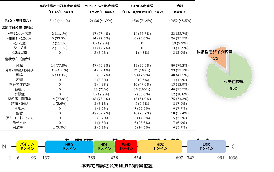 クリオピリン関連周期熱症候群(CAPS)は、NLRP3遺伝子変異によってNLRP3インフラマソームの活性化・過剰炎症が生じ引き起こされる遺伝性自己炎症疾患の1種です。大きく軽症、中等症、重症の症状段階があり、それぞれ家族性寒冷蕁麻疹、Muckle-Wells症候群、CINCA症候群と呼ばれます。CAPSは、体細胞モザイクと呼ばれる、体を構成する細胞のわずか数%が変異を持つだけで発症することも知られています。本邦で初めてCAPS患者の全国調査を実施し、合計101人の患者情報を収集することで日本人におけるCAPS患者の特性を明らかにしました。