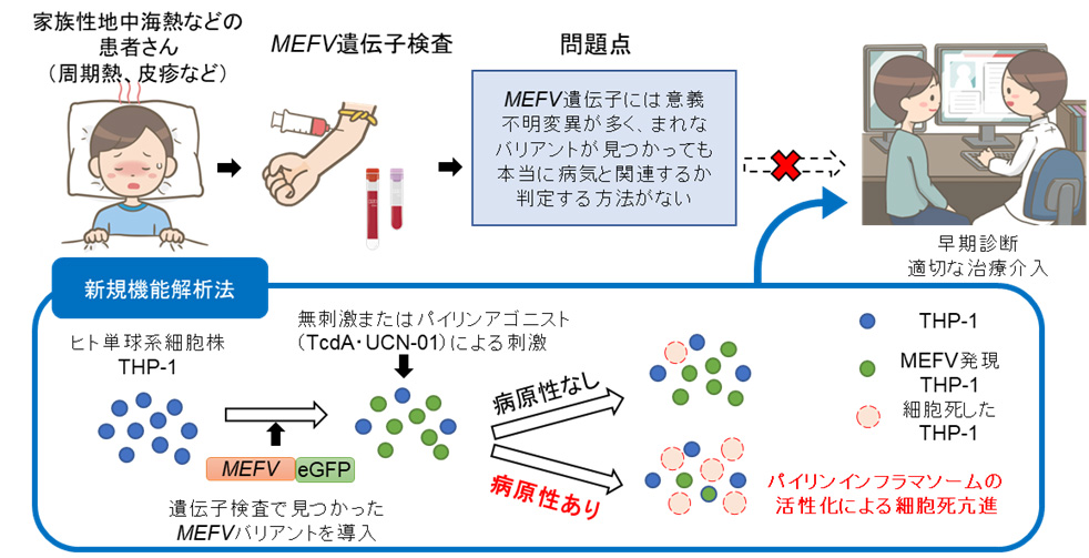 インフラマソームは、侵入した特定の病原体や毒素を検出し、免疫系を活性化してそれらを排除する働きを持つ複合体です。パイリン(pyrin)インフラマソームはその1種で、パイリンはMEFVという遺伝子から作られ、MEFV遺伝子の変異によりパイリンインフラマソームの過剰活性化が生じると家族性地中海熱という疾患が引き起こされます。MEFV遺伝子で生じた変異が実際に過剰活性化の原因となっているかどうかを迅速に解析する方法を新規に開発しました。