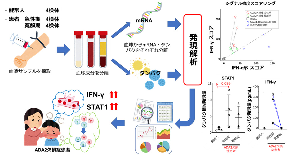 ADA2欠損症は、ADA2遺伝子の機能喪失型変異によって生じる疾患として2014年に報告された常染色体劣性遺伝性疾患です。幼少期から繰り返す発熱、脳梗塞・脳出血といった症状が出現し、重い後遺症を遺すことがあります。日本では2016年から2019年の間に、当科加療中の4名を含む8名のADA2欠損症患者が診断され、京都大学が中心となり疾患に関する情報を集積しています。患者血液サンプルを用いたmRNA・タンパクの網羅的な発現解析結果を比較検討することで、ADA2欠損症患者ではIFN-γ、STAT1が特異的・持続的に発現亢進・活性化していることを世界で初めて明らかにしました。