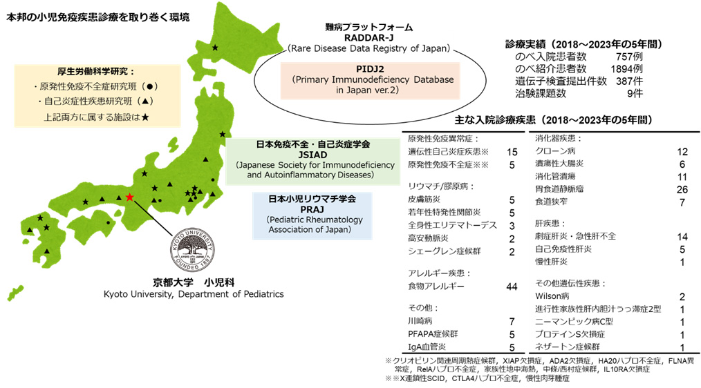 特に、原発性免疫不全症や自己炎症性疾患の診断・治療に関しては、分子生物学的製剤による特異治療、集学的治療のみならず造血細胞移植による根治療法も実施し、高度医療施設として機能しています。加えて、遺伝子検査が保険適応される10年以上以前より遺伝子検査や分子生物学的診断を実施し貢献してきた長年の実績もあり※※※、PIDJ(現在はver..2)等を介して全国から寄せられる相談に対する診療サポート体制をJSIADと協力しつつ現在も担い続けています。原発性免疫不全症候群研究班の関西唯一の分担研究施設として、また自己炎症性疾患研究班でも分担施設として位置付けられ、特に、自己炎症性疾患,家族性血球貪食性リンパ組織球症、自然免疫不全症の診断・研究に関しては本邦の中心的施設となっています。