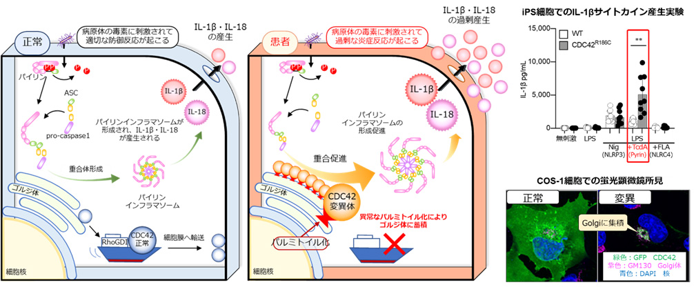 CDC42-C末端病は、CDC42遺伝子の突然変異によって生じる疾患として2020年に報告された、常染色体優性遺伝性疾患です。本邦2症例のうち当院で1例を診断・診療し、患者血液中で IL-1βや IL-18 が著明に上昇していたことからインフラマソーム形成を介した自己炎症性疾患であることを疑い、パイリン(pyrin)インフラマソームによる過剰炎症が患者における主たる炎症経路であることを世界で初めて明らかにしました。